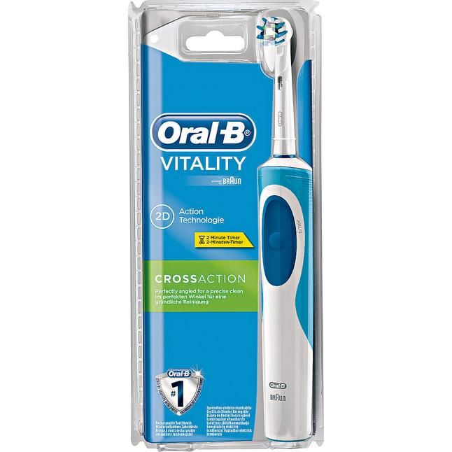 BRAUN Zahnbürste Vitality CrossAction mit Timer- Putzsystem: 2D rotierend- Rotationen pro Min.: 7.600- Ladeteil: Mini- Betriebsart: NiMH Akku- Reinigungsstufen 1 (Reinigen)- Timer: 2-Minuten-Timer- Enthaltene Ersatzbürsten 1 (1x CrossAction )- Farbe: blau/weiß- Vergleichsmodell PrecisionClean (andere Aufsteckbürste) >>Stiftung Warentest Ausgabe 4/2013 SEHR GUT 1,5
